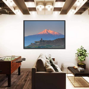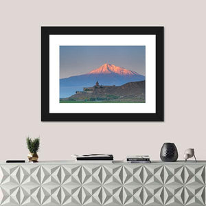 This landscape artwork features a majestic view of the Church in Khor Virap, set against snow-capped mountains and ancient ruins. The serene colors of blue, pink, and brown evoke a peaceful atmosphere, making it a beautiful addition to your home decor.