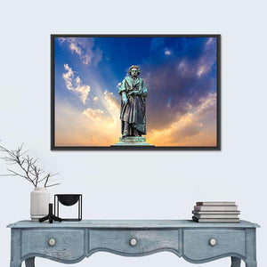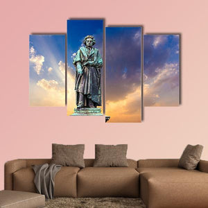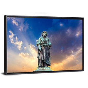 A centered bronze statue of Beethoven stands beneath a dramatic sunset sky with sun rays. Rendered photorealistically in a blue, orange, brown and white palette, the image brings a dramatic yet serene presence to modern room decor and house interiors.