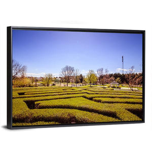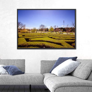 Hirschstetten Garden in Vienna shows a leafy hedge maze and trees under a clear blue sky, captured in a nature photography style. The aerial perspective and leading lines create depth, while sunlight-cast shadows and a distant pole give a peaceful, sunny mood. Suits living rooms or nature-themed spaces.