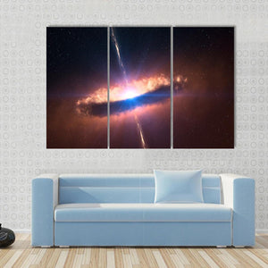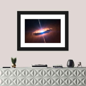 This captivating canvas features a dynamic representation of a galaxy, complete with a glowing accretion disk and stunning relativistic jets. The intense interplay of blue, orange, and black creates an awe-inspiring cosmic atmosphere that adds depth to any space.