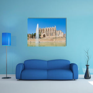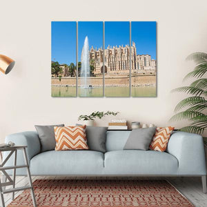 This canvas art captures the majestic Gothic architecture of Palma de Mallorca, showcasing a serene scene with a large water fountain. The bright palette of blue, tan, green, and white adds a vibrant touch, making it an ideal piece for your home decor.