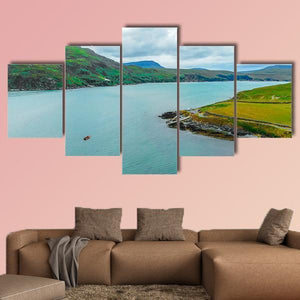 Kyle of Durness, Scotland appears here as a calm landscape: an aerial view of a quiet bay backed by rolling hills, with a single small boat on the water. Muted blues, greens and grays create a serene, expansive feel that suits modern living rooms or home offices.