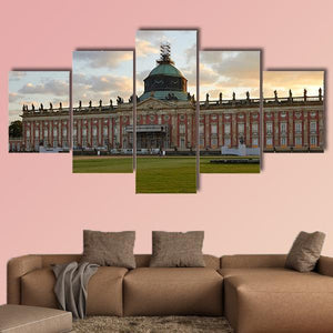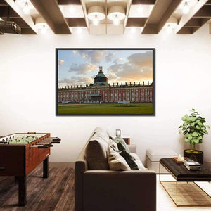 The Neues Palais in Germany is shown as a photorealistic landscape of palace, lawn, and sky, with red, green, blue and gold tones that give a grand late-afternoon feeling. This canvas print suits room decor in living spaces or entryways with classical or modern sensibilities.