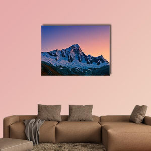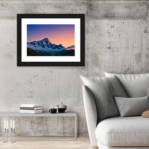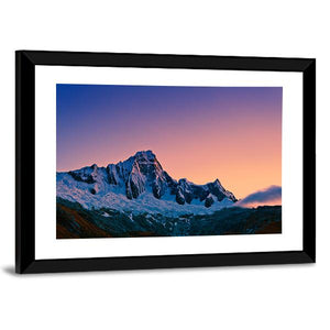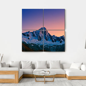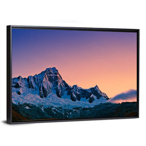 This canvas art features stunning snow-capped mountains and an icy glacier, capturing the serene beauty of nature. The photorealistic style and gradient sky in shades of blue, pink, and gray evoke a peaceful ambiance, perfect for enhancing any living space.
