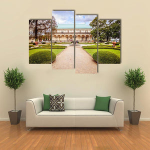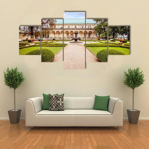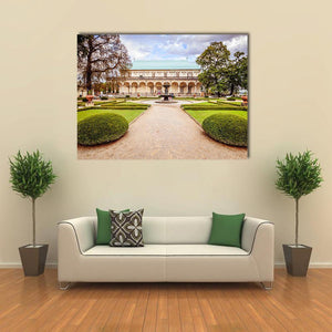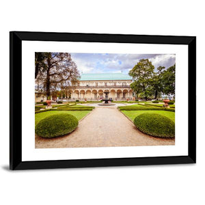 A photorealistic view of a palace garden in Czechia, centered on a gravel path that leads to an arched colonnade and a fountain with figures. Symmetrical beds, topiary hedges and a soft palette of greens, tans and blues create a serene, grand, and peaceful atmosphere that suits traditional or classic interiors.