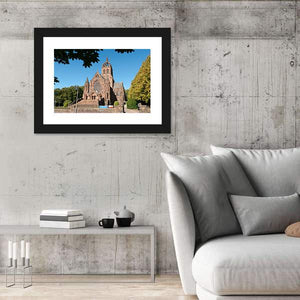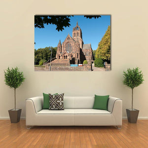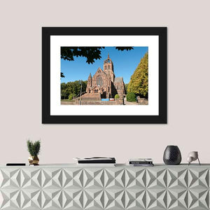 This canvas wall art captures the grand beauty of the Thomas Coats Memorial Church, showcasing its impressive stone structure, tall spire, and vibrant stained glass windows against a clear blue sky. Surrounded by lush green trees, it brings a historic and bright atmosphere to your decor.