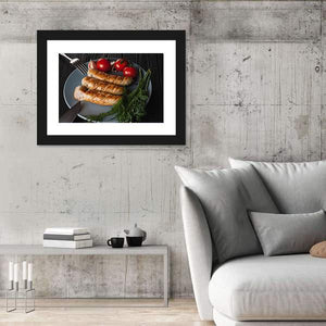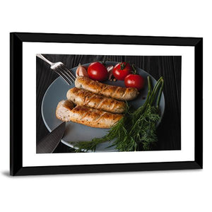 This canvas art features a close-up, overhead view of grilled sausages, fresh cherry tomatoes, and herbs. The warm palette of grey, green, red, and brown creates an appetizing and hearty mood, perfect for bringing a touch of food-inspired decor to your kitchen or dining area.