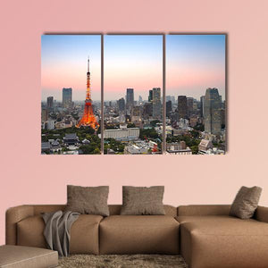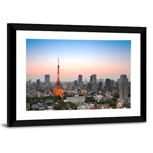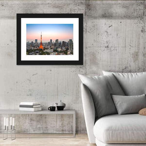 Tokyo Tower and the surrounding skyscrapers appear in an aerial, wide-shot cityscape that reads like a photograph. Warm orange, pink and blue tones meet grey silhouettes in a vibrant twilight scene that fits modern living spaces and contemporary room decor.