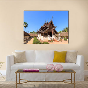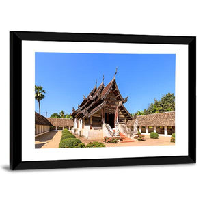 A realistic print of Ton Kwen Temple set in a sunny courtyard, showing tiered roofing, a wooden structure, staircase and a palm tree. The bright, serene scene uses brown, green and blue tones for a calm, cultural feel that suits home and modern decor.
