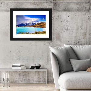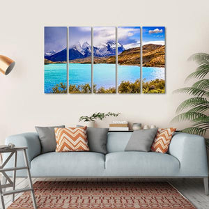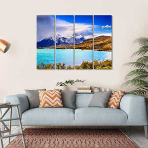 This canvas features the breathtaking landscape of Torres Del Paine in Chile, showcasing majestic mountains, a serene lake, and fluffy clouds. The vibrant colors of turquoise and brown create a wild yet calming atmosphere, perfect for bringing a touch of nature indoors.