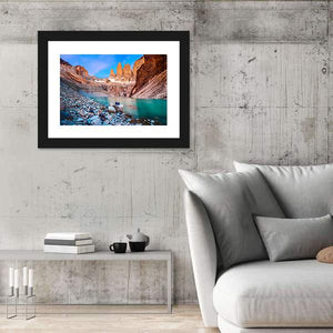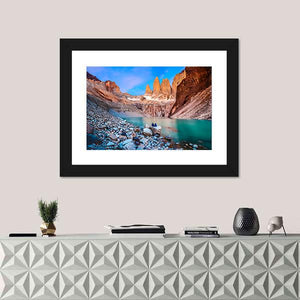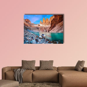 This canvas captures the mountains, turquoise lake, and rocky shore of Torres Del Paine National Park in Chile with a serene, majestic mood. The realistic composition emphasizes depth and framing—three prominent rock spires and two figures seated on the rocks—rendered in a blue‑green, brown, and white palette that suits modern home decor.