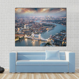 This canvas wall art captures the stunning London skyline with an aerial view of Tower Bridge over the River Thames. The majestic scene features a vibrant palette of blues, oranges, and yellows, highlighting the illuminated cityscape and a dramatic sky filled with clouds and sun rays.