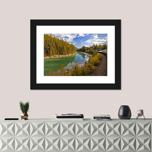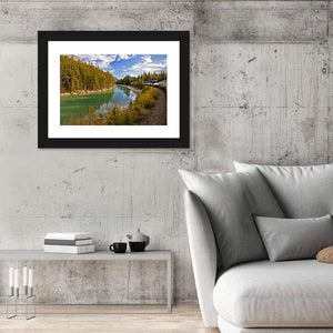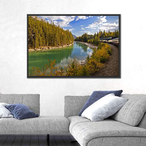 This canvas art depicts a serene train journey alongside a tranquil river, framed by majestic mountains and vibrant autumn foliage. The blend of earthy greens and calming blues evokes a peaceful atmosphere, making it a captivating addition to any nature-inspired décor.
