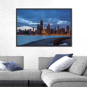 Chicago skyline and Lake Michigan in the blue hour: calm water reflects illuminated buildings while the Willis Tower rises beneath a cloudy twilight sky. The photorealistic, modern scene uses blue, gray and warm yellow-orange accents for a tranquil, urban mood that suits modern living rooms or offices.