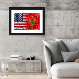 This canvas features the United States and Montenegro flags in a split, overlapping design, with visible wavy fabric texture and Montenegro’s coat of arms. The modern, graphic treatment uses a red, blue, white and gold palette to convey a patriotic, united and symbolic mood. It suits house settings and modern room decor that favor bold national motifs.