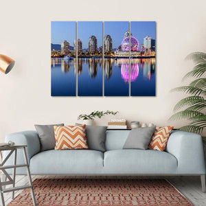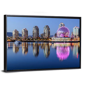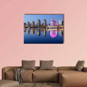 Capture the serene beauty of Vancouver's skyline at night with this vibrant canvas art. Featuring a stunning reflection of buildings and a glowing purple dome, it adds a modern touch to any space.