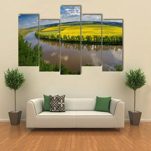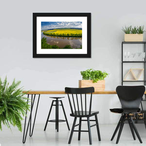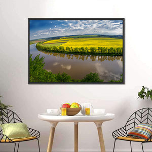 An aerial view of the Dniester River winding through a vibrant yellow flower field, with trees, clouds and reflective water under a calm summer sky. The peaceful, natural palette of yellow, green, blue, brown and white suits modern, nature-inspired rooms in the home.