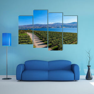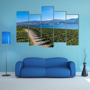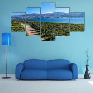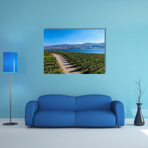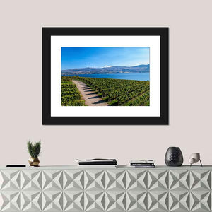 Lake Okanagan From Mission Hill shows a photographic landscape of rows of grapevines and a dirt path that lead the eye toward a calm lake and distant mountains under a clear blue sky. The scene feels serene, expansive, and bright, with a green, blue, tan, and white palette. It suits modern room decor in living rooms, dining areas, or entryways.