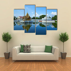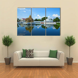 A realistic landscape of Bang Pa In Palace in Thailand, showing the ornate golden temple and the white domed building mirrored on calm water. The symmetrical scene, soft blues, golds, whites and greens, and puffy clouds create a serene, majestic mood that suits living rooms, entryways, or offices.