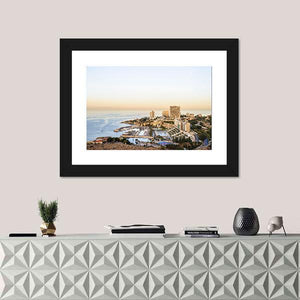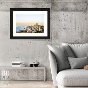 View of Beirut shows a high-angle photographic cityscape of Beirut’s coastline, with high-rise buildings and boats in the harbor beneath a clear sky. The blue, white, tan and green palette creates a peaceful, scenic, bright mood and works well in living rooms or travel-inspired spaces.