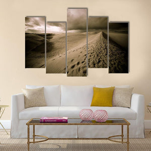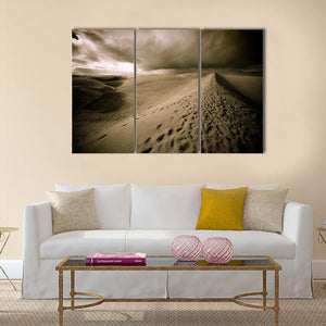 This canvas art features a dramatic landscape of sand dunes under a stormy night sky. The rows of footprints on the surface add a sense of loneliness and depth, perfect for adding an evocative touch to your wall.