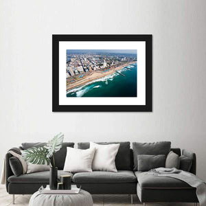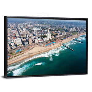 This vibrant canvas features a lively city skyline of Durban, South Africa, showcasing its beach and ocean views. The aerial perspective captures the dynamic atmosphere, enhanced by a palette of blue, green, and gray.