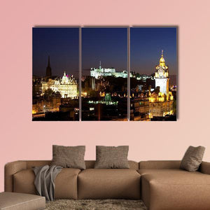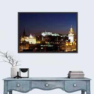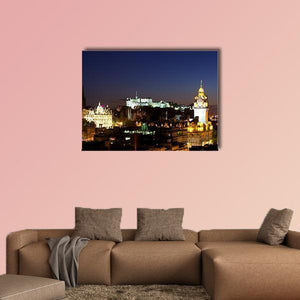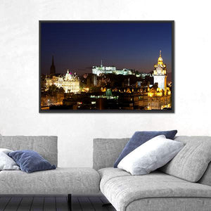 Edinburgh Castle and the city skyline as seen from Calton Hill at night, captured in a photorealistic canvas print with illuminated buildings and a visible clock tower. Dark blues and warm yellow-orange lights create an atmospheric, vibrant, historic mood. Suits modern living room or office decor.