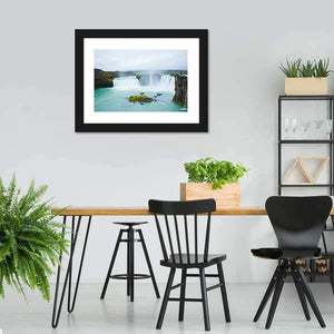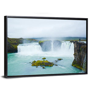 This canvas art captures the breathtaking Godafoss waterfall, showcasing the serenity and awe-inspiring beauty of Northern Iceland. A lone figure stands on the cliff's edge, inviting you to experience the tranquility of nature.