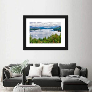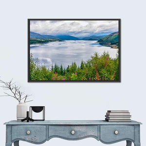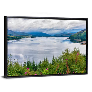 This landscape artwork captures a serene view of Loch Carron, showcasing a tranquil lake surrounded by majestic mountains and vibrant wildflowers. Its natural hues of blue, green, and pink create a calming atmosphere that can enhance any room.