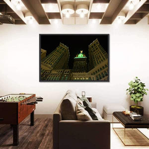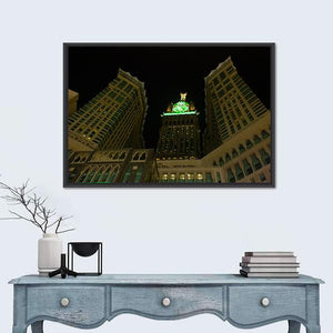 This canvas wall art showcases the grandeur of Mecca's Clock Tower illuminated against the night sky. With a worm's-eye view perspective, the piece captures the dynamic contrast of dark tones paired with green and gold highlights, creating a striking depiction of modern architecture.