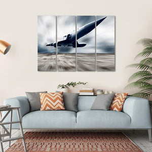 This dynamic canvas art features a jet plane in mid-flight, soaring upwards with a striking motion blur effect. The blue, gray, and black palette captures the powerful essence of military aviation, making it a compelling choice for your wall decor.