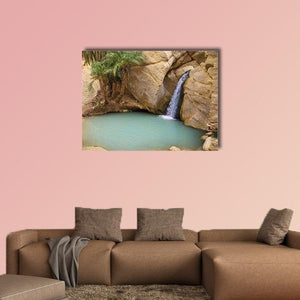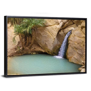 Capture a serene moment with this beautiful depiction of a waterfall at the Mountain Oasis Chebika in Tunisia. Featuring clear turquoise water surrounded by jagged rocks and lush palm trees, this artwork brings a natural tranquility to your space.