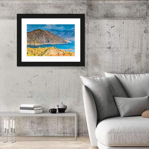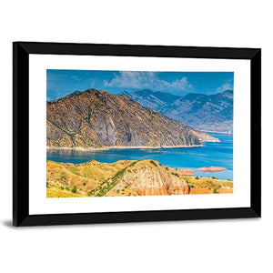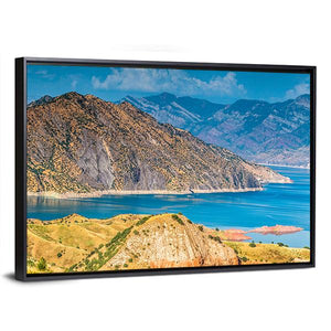 This canvas art features a breathtaking view of the Nurek Reservoir in Tajikistan, showcasing majestic mountain ranges and a serene lake. The rich palette of blue and green, combined with dramatic peaks and striated rock formations, creates a vast and tranquil atmosphere for any space.