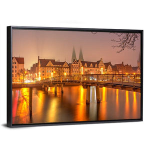 A realistic cityscape of Lubeck’s old town pier, featuring pointed-roof buildings, a bridge and the waterfront in warm orange, yellow and gray tones. Street lights reflecting on the water and bare tree branches in the upper right create a vibrant, atmospheric nighttime mood. Works well in modern living rooms, hallways, or other urban-style interiors.