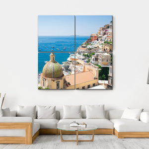 This canvas artwork captures the serene beauty of Positano, showcasing its charming coastal town, a stunning dome church, and vibrant ocean scene. The vibrant blues and terracotta hues evoke a sunny, tranquil atmosphere that brightens any space.