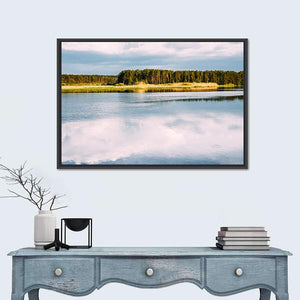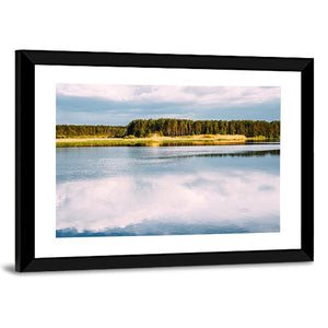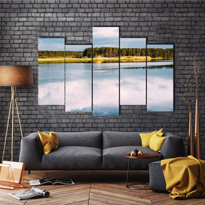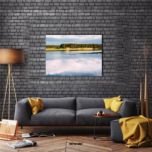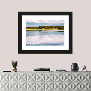 This landscape artwork captures a serene river scene, where blue water meets lush green trees under a bright sky adorned with clouds. The calming palette and realistic details invite peace into your space.