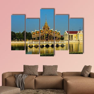 Photorealistic view of the Bang Pa-In Royal Palace in Thailand, featuring the ornate golden roof, a bridge, trees and their reflection in calm water. Sunlit blues, golds and greens give the scene a tranquil, sunny, majestic atmosphere. Suited for modern homes and room decor.