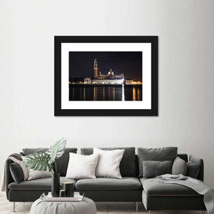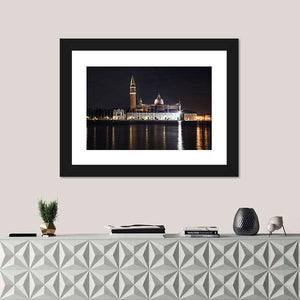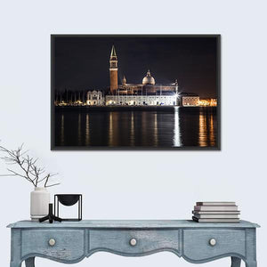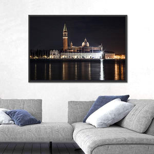 This photographic canvas shows St George's Church in Venice at night, a wide cityscape of waterfront architecture. Blue, white, gold and black tones highlight illuminated windows, a domed building and bell tower mirrored in the canal reflections for a serene, historic mood. A calm, modern piece that suits room decor in living rooms, entryways, or studies.