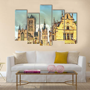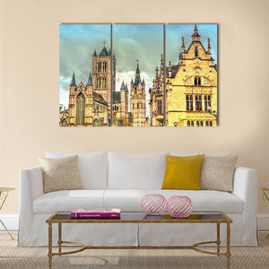 View of St Nicholas Church places the cathedral and surrounding buildings in a wide-angle cityscape beneath a cloudy sky. Gothic architectural detail and a palette of blue, yellow, grey, and green create a historic, grand, atmospheric print that works well in living rooms, hallways, or studies.