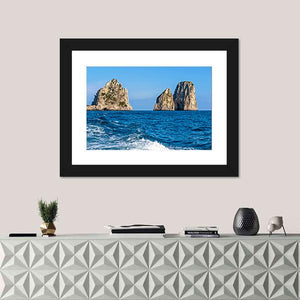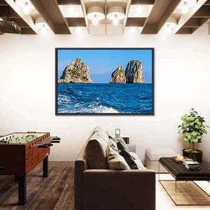 View Of The Faraglioni Rocks depicts two large rock formations rising from the sea, with rolling waves and a blue, white and gray palette that feels serene and majestic. The realistic landscape works well in coastal or modern room decor.