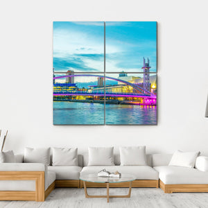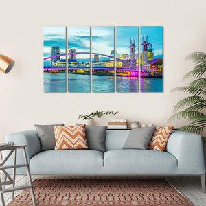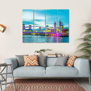 This vibrant cityscape features the iconic Lowry Theater in Manchester, showcasing a stunning illuminated bridge and modern architecture against a twilight sky. The lively interplay of blue, pink, and yellow creates an energetic atmosphere, making it a captivating addition to any urban-inspired decor.