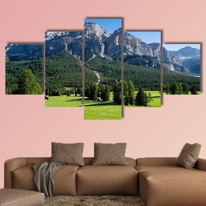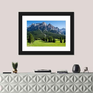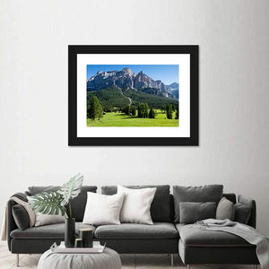 A photorealistic landscape showing jagged mountain peaks, a dense evergreen forest, and a sunlit green meadow beneath a clear blue sky. Its serene, majestic mood suits modern homes and nature‑inspired room decor.