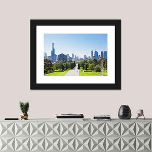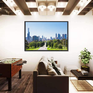 A photorealistic cityscape that captures a daytime view of a Melbourne skyline with tall modern buildings, manicured lawns, a row of trees and a path. The image reads bright and serene, with blue, green, gray and white tones under a clear sky. Suited for modern living rooms or office walls where a calm urban touch is wanted.
