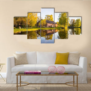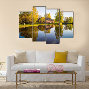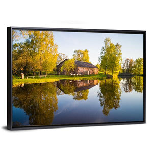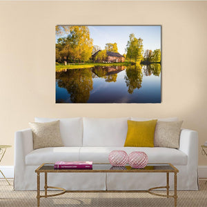 A peaceful, realistic landscape that shows trees and their reflection on a calm lake, with a barn-like building and autumn foliage. Soft greens, browns, blues and touches of yellow and a rule-of-thirds composition create a balanced, serene scene that suits modern or nature-inspired interiors.