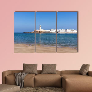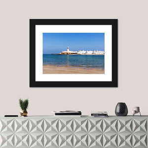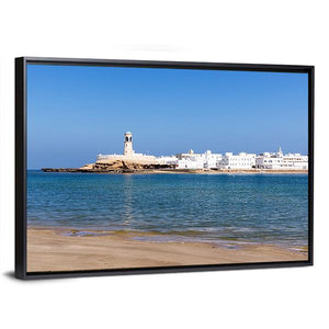 This photographic canvas shows the Sur lighthouse and the clustered coastal town beside calm blue water and a clear sky. The rule-of-thirds composition and a blue, white, tan palette create a serene, bright, peaceful mood. It works well in coastal or modern rooms as beach-inspired wall decor.