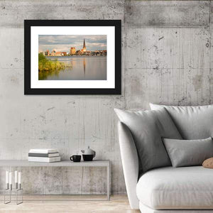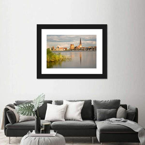 A photorealistic cityscape that frames a riverside skyline with a tall church spire, water reflections and reeds in the foreground. Its calm, serene, picturesque mood and muted palette of browns, greens, blues and grays suits modern living rooms or entryways.