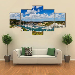 Marina Of Porto Cervo Canvas Wall Art shows a sunlit yacht harbor with numerous sailboats and buildings nestled into green hills. The photorealistic, wide-angle aerial view highlights bright blues, greens, whites and ochres and suits modern or coastal-inspired rooms.