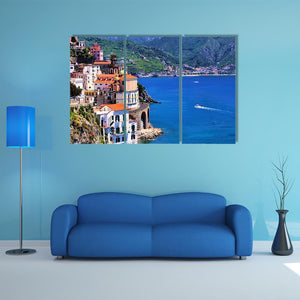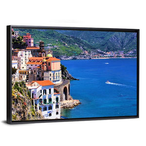 This vibrant canvas wall art captures the beauty of the coastal town of Atrani, showcasing its stunning buildings perched on cliffs, boats gracefully sailing in the ocean, and the majestic mountains in the background. Its photorealistic depiction brings a refreshing touch to any space.