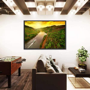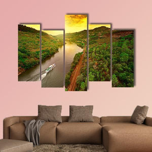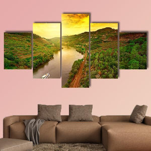 Vineyards along the River Douro in Portugal are shown from an aerial sunset view, with terraced hillsides and a boat leaving a wake across the river. The realistic canvas uses lush greens and warm sunset tones for a serene, picturesque, and vibrant atmosphere that fits modern or nature-inspired rooms.