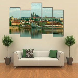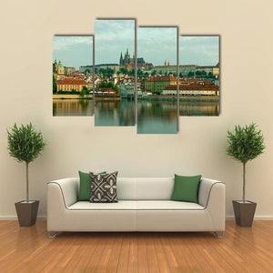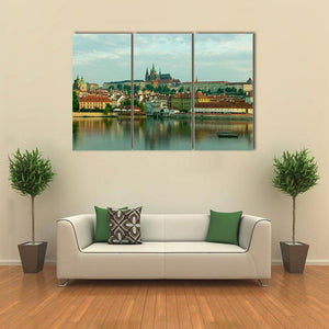 A realistic cityscape of the Vltava River showing riverside buildings and a distant castle, rendered in calm blues, greens, tan, and grey. The serene, historic mood fits modern or classic interiors seeking thoughtful room decor.